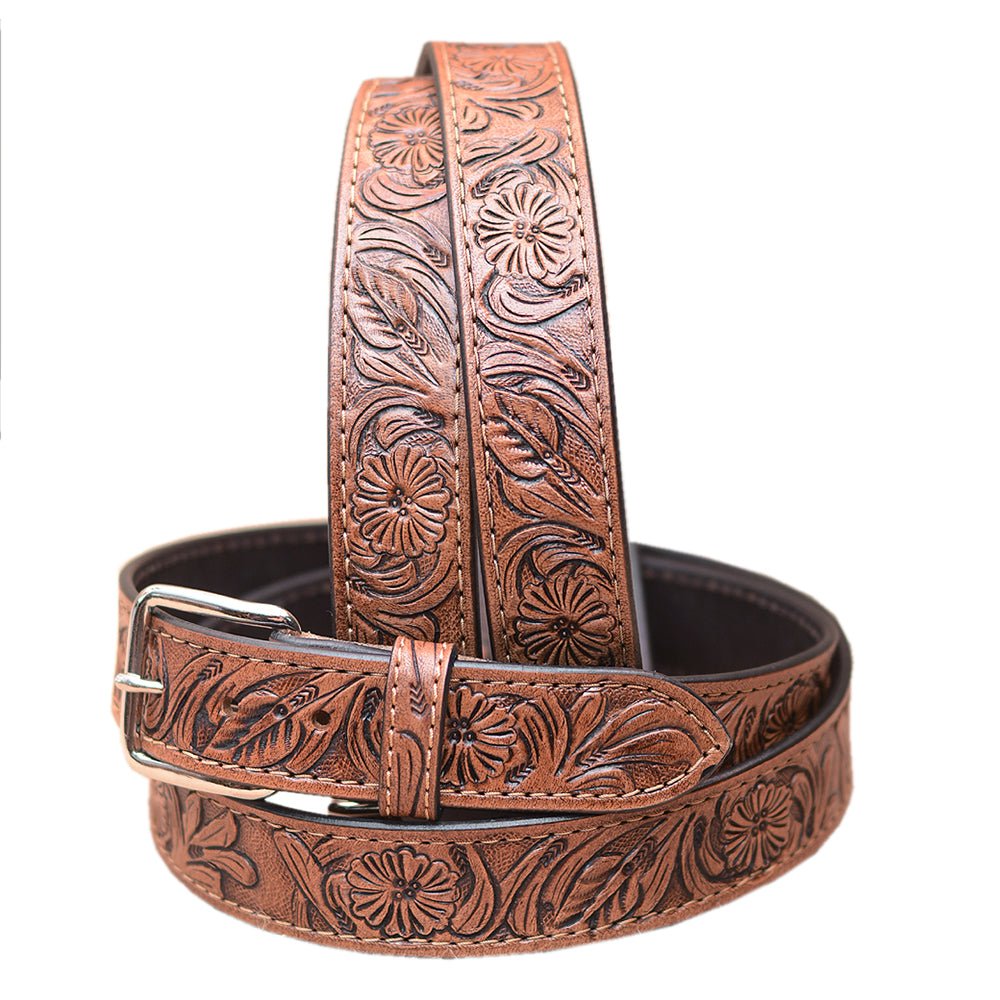 Unisex Western Full-Grain Leather Belt With Floral Tooled Design For Everyday Wear